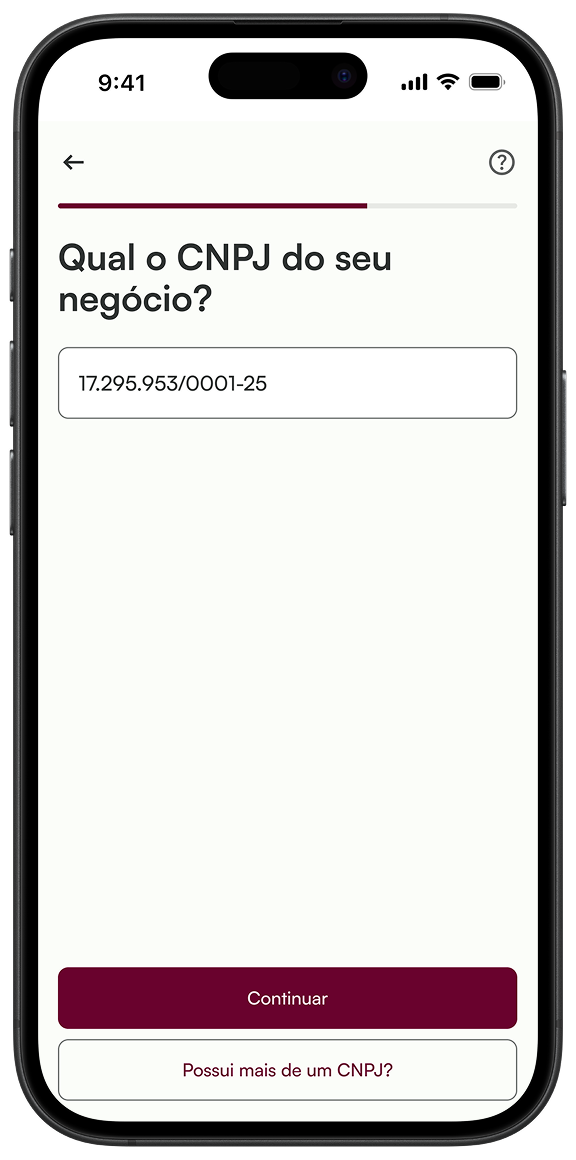 Após baixar o aplicativo, basta clicar em "Cadastrar” e responder o onboarding com os seus dados e da sua empresa