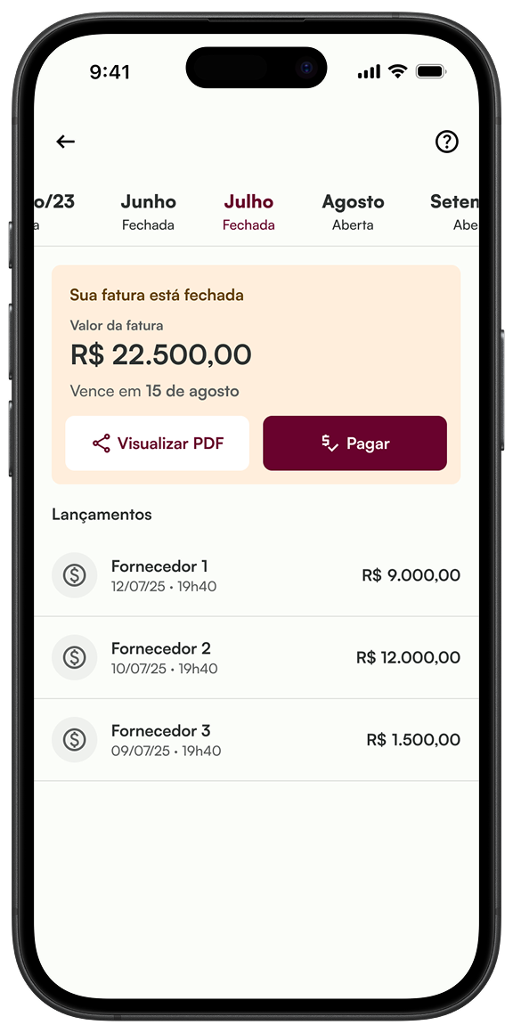 Todas as suas parcelas em uma fatura mensal, disponível no app e no seu e-mail.